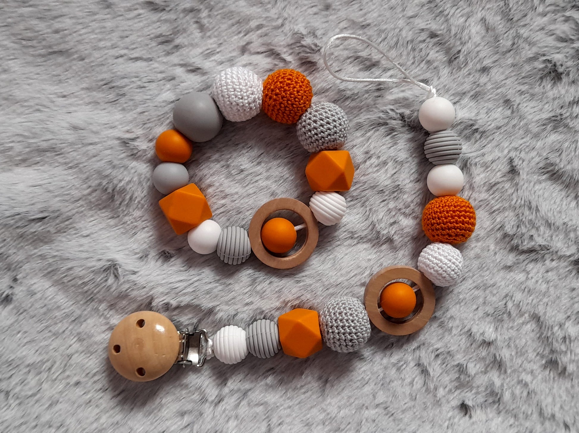 The dummy clip holder is made from silicone, wood and crochet beads. Crochet material beads are handmade with using 100% pure and soft cotton yarn. They have different sizes of wooden beads to crochet around and strong nylon cord.