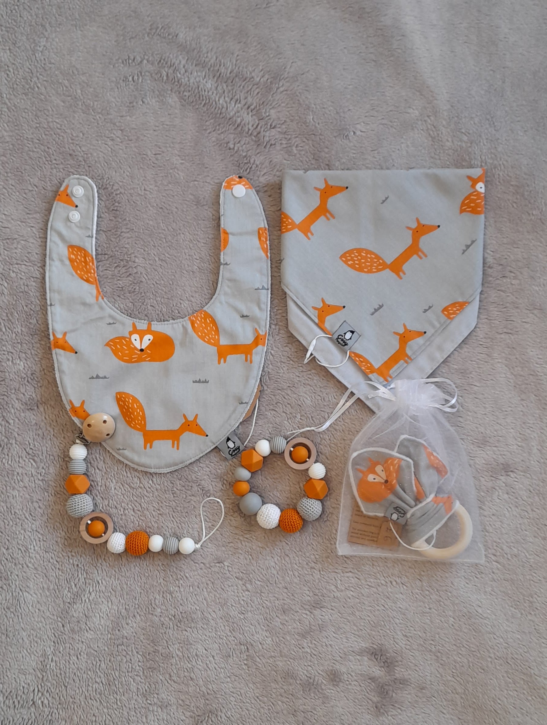 Gift Set B - set of 5 - Reversible Bib, Bib, Dummy Clip, Silicone Ring and Small Wooden Ring