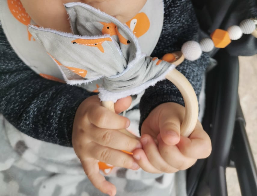 The ring has a mix of textures and materials that will enchant babies and parents alike. The ring is made from silicone, wood and crochet beads. Crochet material beads are handmade with using 100% pure and soft cotton yarn. They have different sizes of wooden beads to crochet around and strong nylon cord.