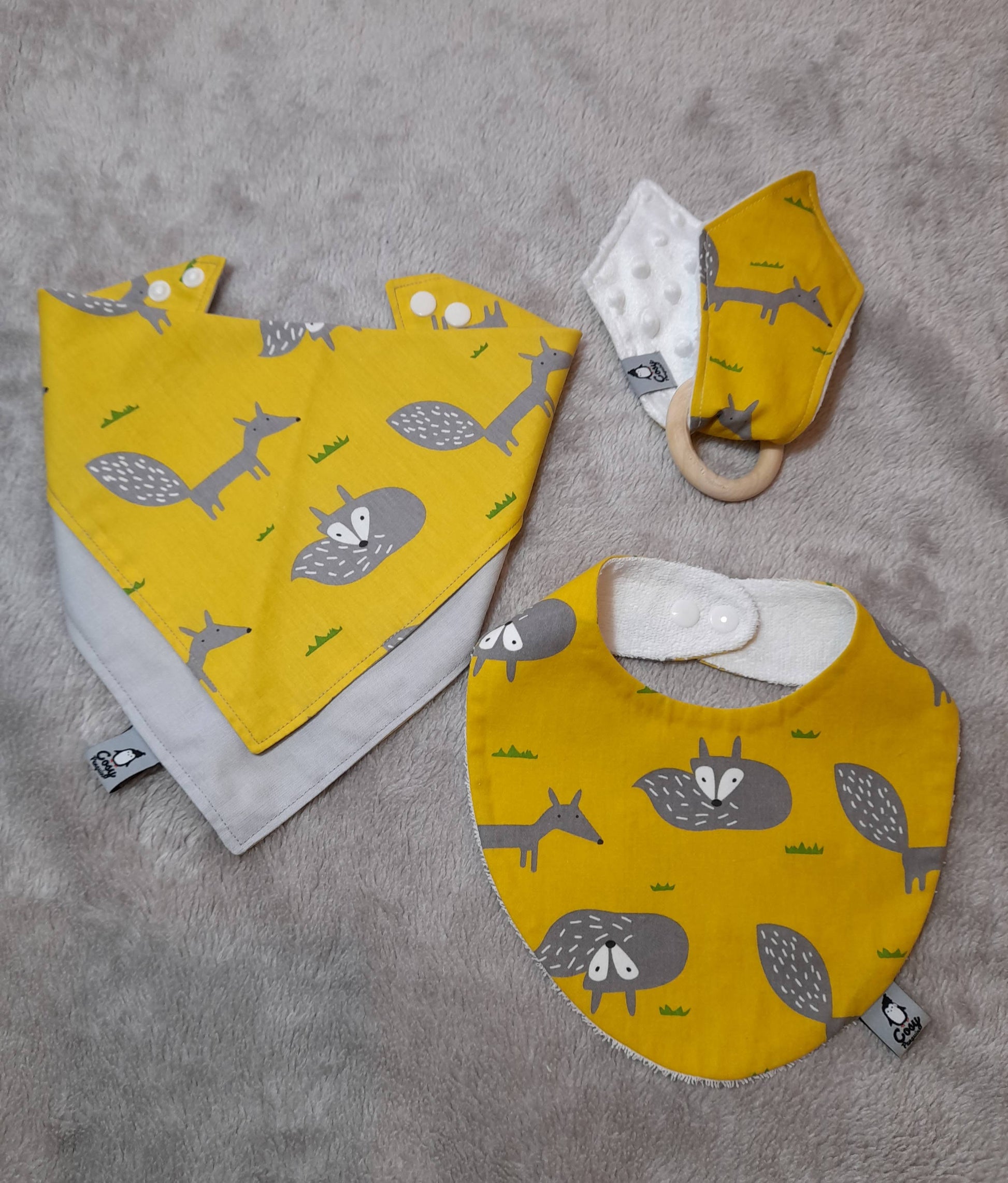 Reversible 100% cotton bibs are perfect to use while teething to keep your baby skin dry. Adjustable snaps provide different sizing as the baby/toddler grows. Can be used on both sides. On one side there is a fox pattern and on the other side it is plain.