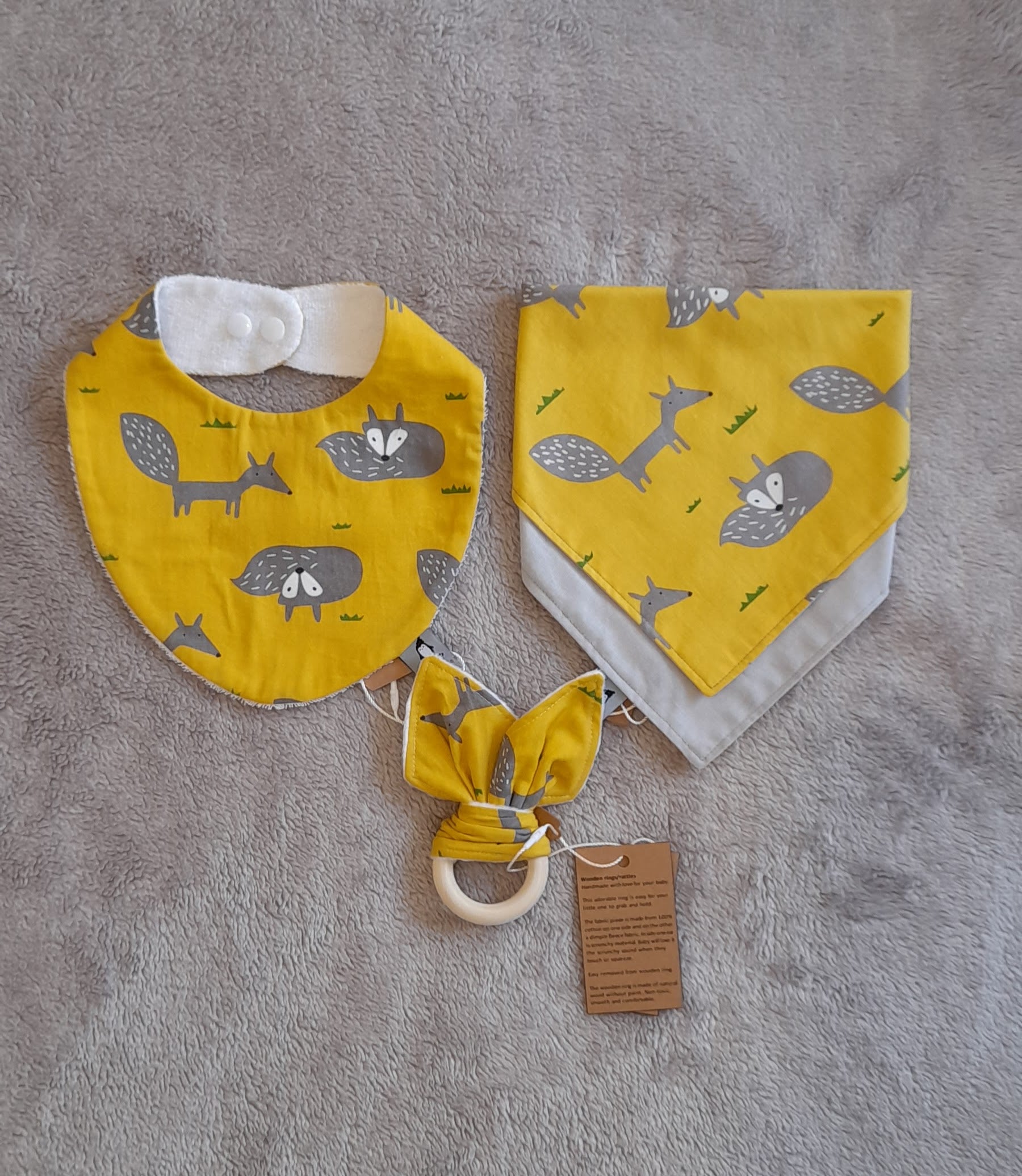 Gift Set C - set of 3 - Reversible Bib, Bib and Small Wooden Ring