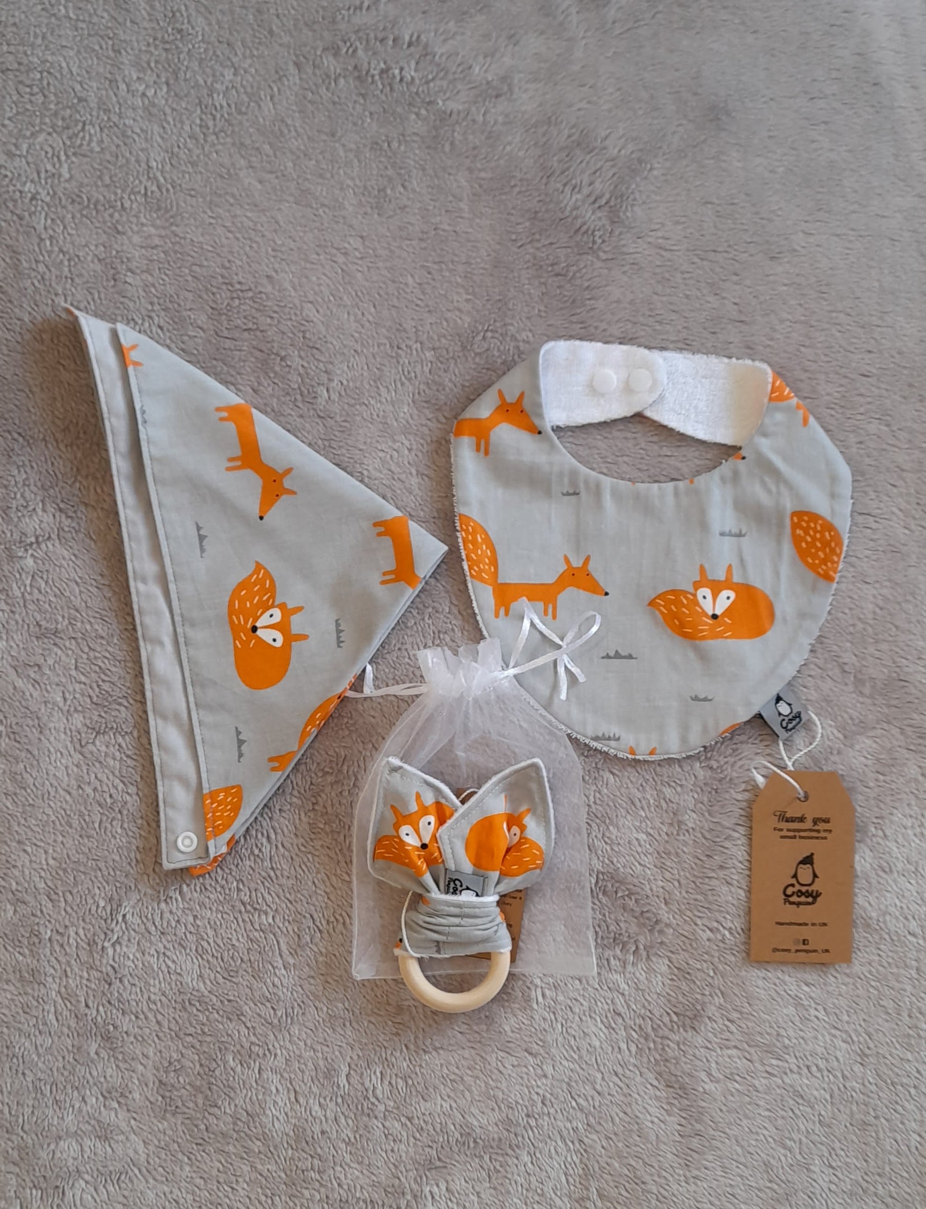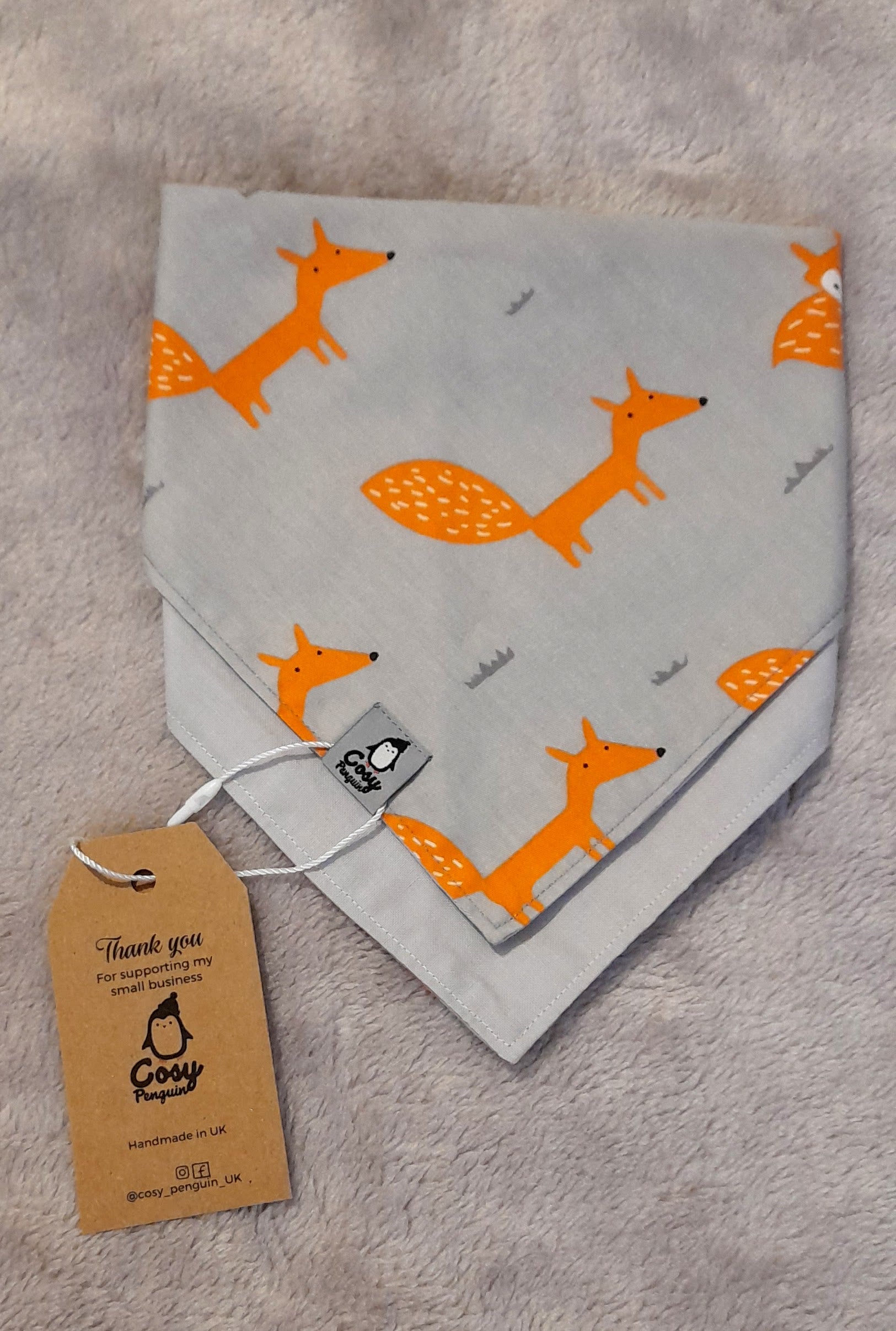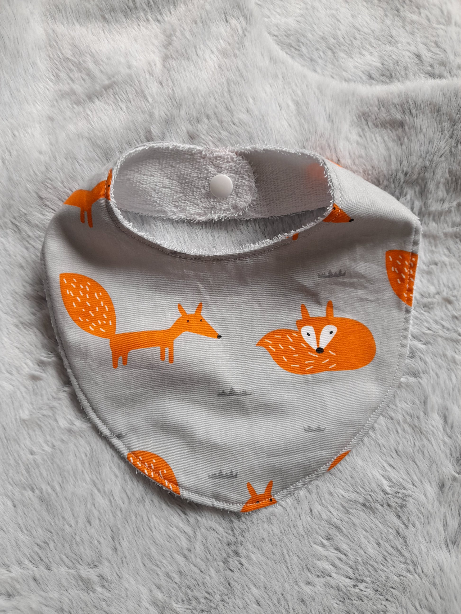 Reversible 100% cotton bibs are perfect to use while teething to keep your baby skin dry. Adjustable snaps provide different sizing as the baby/toddler grows. Can be used on both sides. On one side there is a fox pattern and on the other side it is plain.