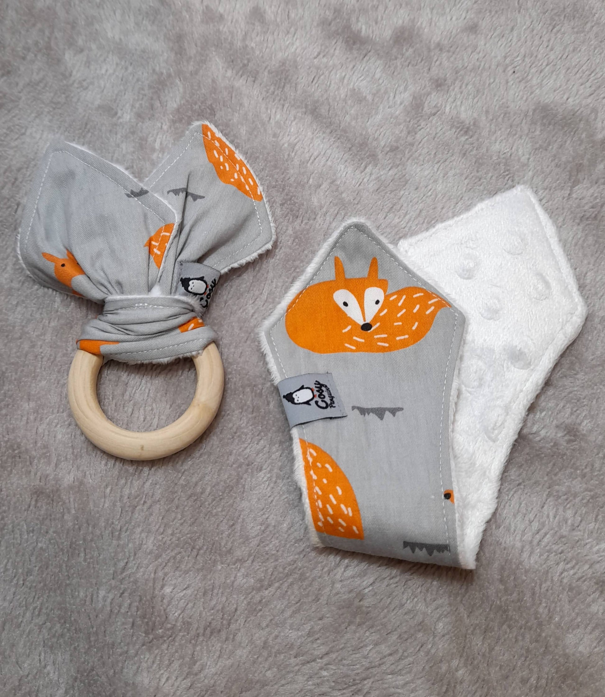 The fabric piece is made from 100% cotton on one side and on the other a dimple fleece fabric. Inside one ear is scrunchy material. Baby will love the scrunchy sound when they touch or squeeze.